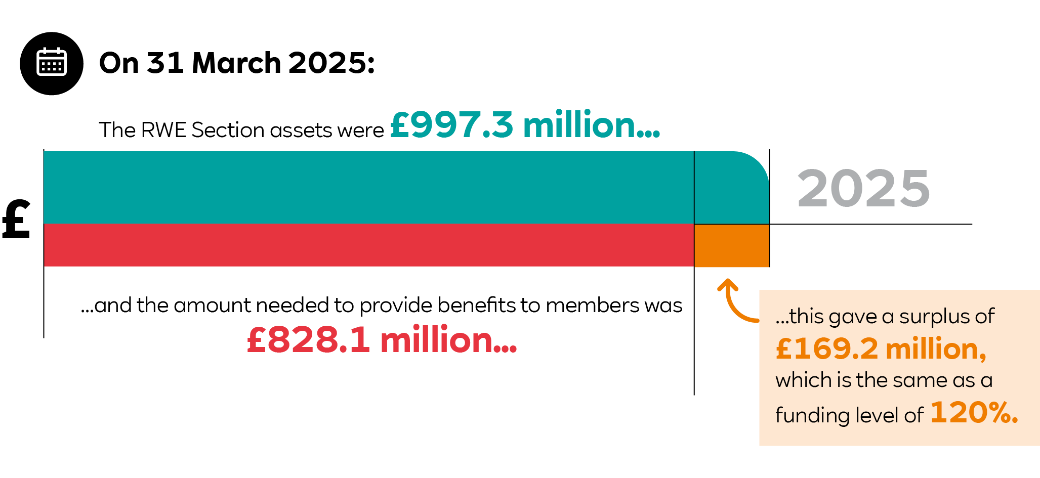 The funding position of the RWE Section improved between 31 March 2024 and 31 March 2025, largely due to interest on the existing surplus. The value of the liabilities reduced as a result of benefit payments and an increase in gilt yields over the year, but this was broadly offset by a reduction in the value of the RWE Group’s assets.