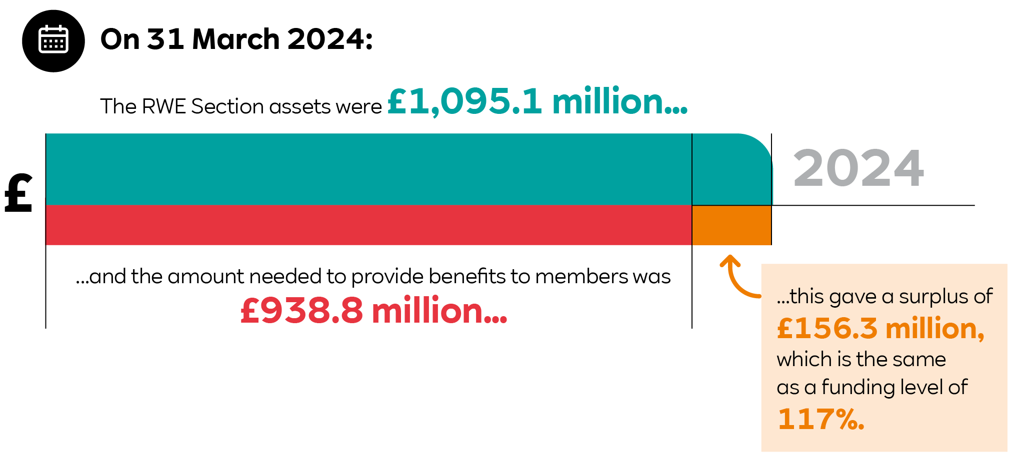 The Actuary calculated that if the RWE Section had wound up on 31 March 2024 (the date of the last full Actuarial Valuation), it would have had £48.0 million more assets than the estimated cost of ensuring that all members’ benefits (including wind-up expenses) could be paid in full, equal to a funding level of 105%.